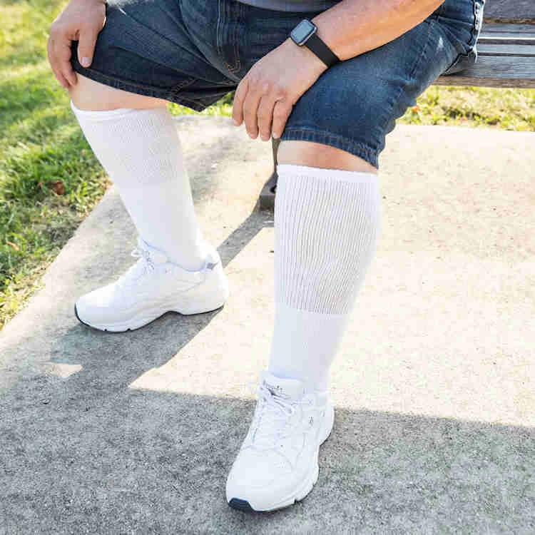 The Extra Wide medical tube sock is designed for people who are tired of squeezing into tight fitting tube socks! Made from soft ring spun cotton, these socks can stretch up to 24 inches in the calf while still maintaining their shape. Not only is the calf wide, but the whole sock is made wider for people with a wider foot, ankle, and leg. These socks fit beautifully under boots and AFO braces. You can also use them as a pet sleeve after surgeries instead of the cone of shame. Your furry babies will be in soft comfort while healing (see the picture below of Halo the cat in her tube sock). Rest assured, we’ve got you covered. The socks have an inverted toe seam, for a seam free feel. Infused with Microban to help inhibit the growth of odor causing bacteria. Feel the difference a wider tube sock can make. Sold as a 3 pack. Available in white and black. The socks are unisex and fit shoe sizes from women’s size 6.5 all the way up to men’s size 16 up to a 6E width. Sock length will vary on your leg, depending on the length of your foot and the width of your leg. Made in the USA!